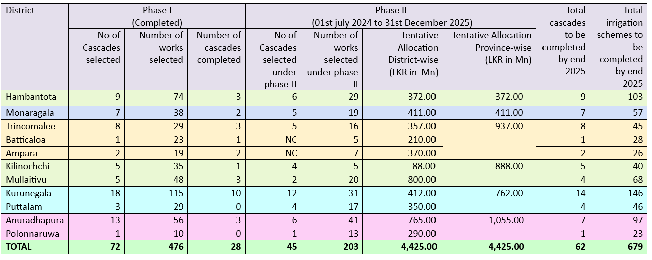 The following table explains the ongoing tank rehabilitation and cascade development in climatically vulnerable hotspot areas in Sri Lanka.